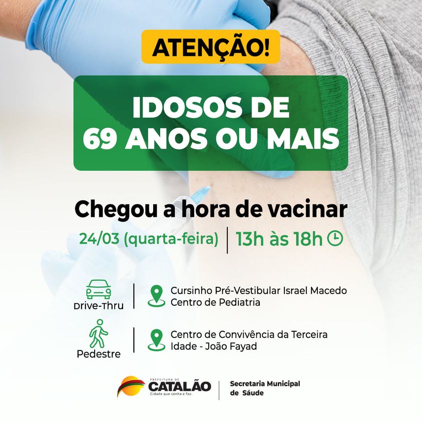 Na tarde desta quarta-feira (24), já estarão liberadas doses para uma nova faixa etária. Será a vez das pessoas com 69 anos ou mais serem vacinadas. A vacinação acontecerá das 13h às 18 horas.