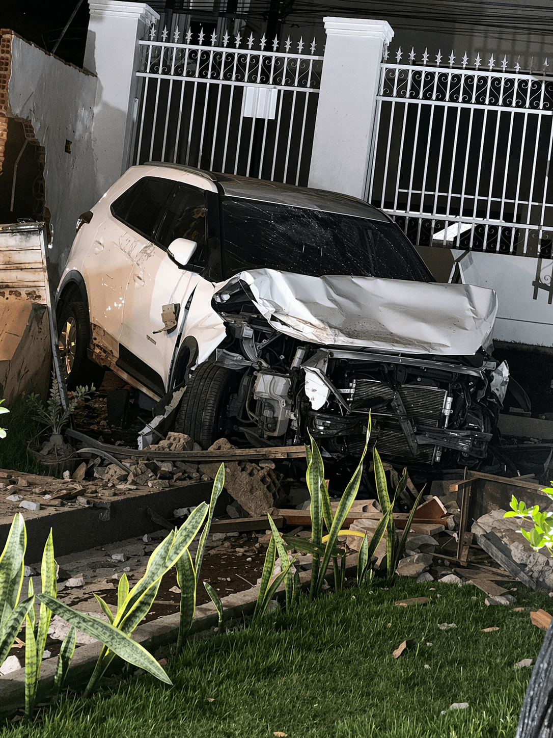 Na noite deste sábado (18), um acidente de trânsito foi registrado na Rua Elias Democh, próximo ao Cemitério Municipal, em Catalão. Por volta das 21h40, a condutora de um veículo Hyundai Creta perdeu o controle da direção, subiu na calçada e invadiu dois imóveis comerciais, derrubando o muro de proteção que dava acesso a um escritório imobiliário e a um restaurante.
