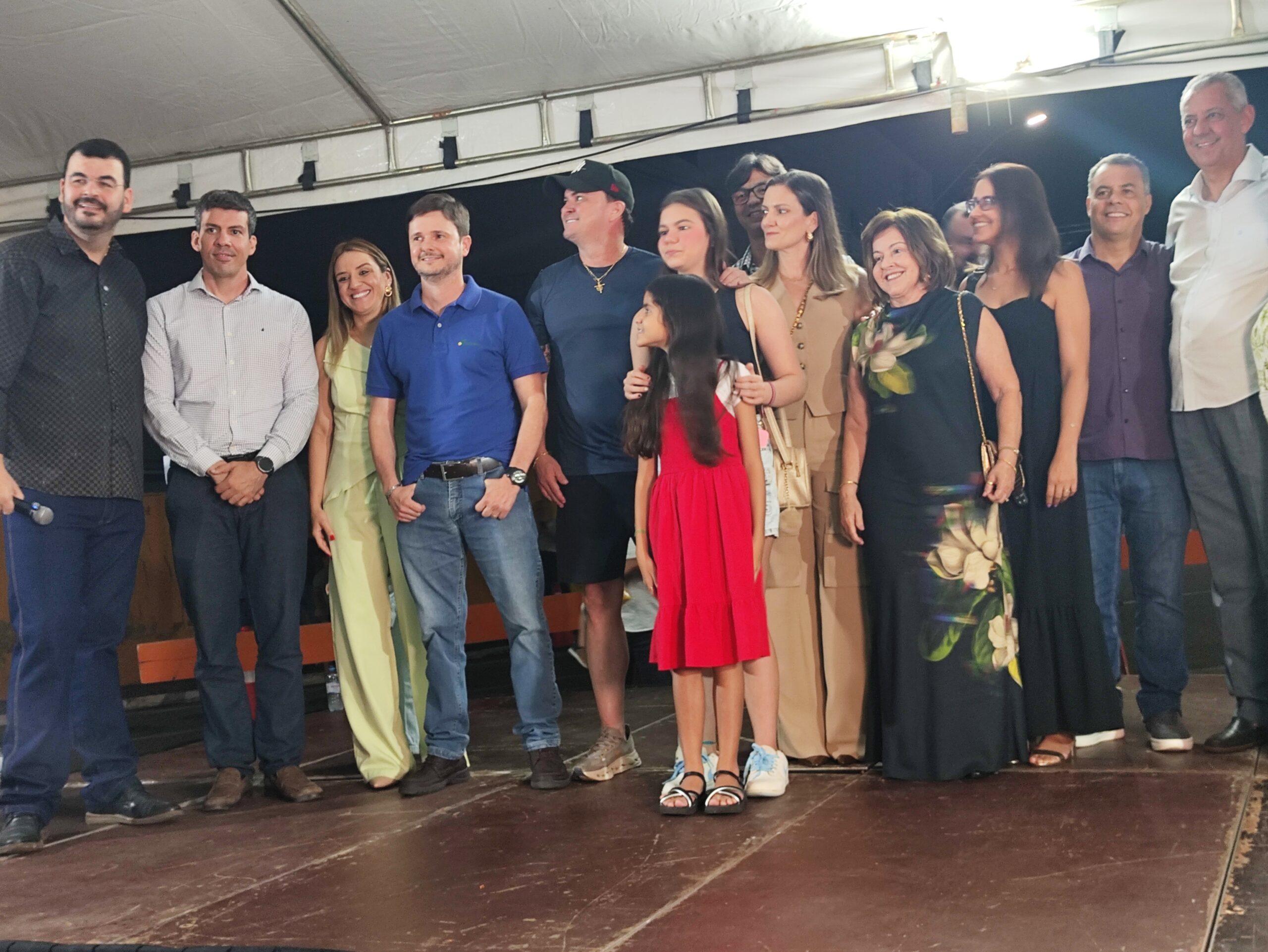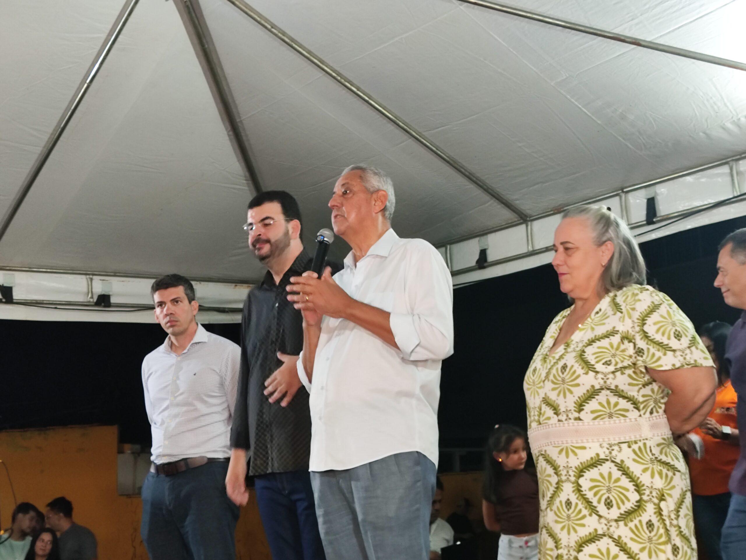 Prefeito Velomar discursa ao lado da primeira dama Neusa Rios, vereador Rodrigão e o ex-presidente da Goinfra, Pedro Salles