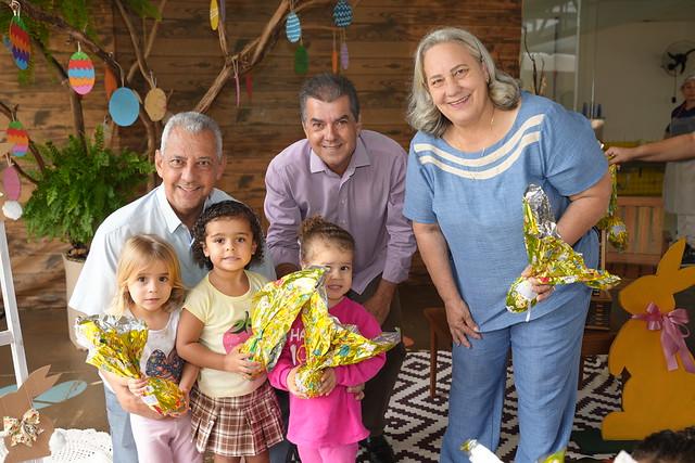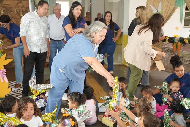 Prefeito Velomar, secretário de Educação Adilson Ciríaco, e a secretária de Ação Social, Neusa Rios, fizeram a entrega dos ovos de chocolate nas escolas municipias