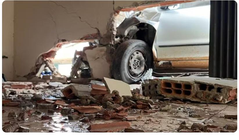 Imagens registradas após a colisão mostram parte do muro da garagem destruído e um encanamento rompido, o que provocou vazamento de água.