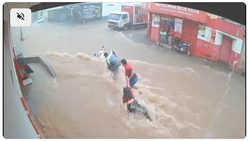 Duas mulheres foram arrastadas pela enxurrada durante uma forte chuva em Montes Claros, no Norte de Minas, na tarde desta terça-feira (10). Imagens de câmeras de segurança mostram as vítimas sendo levadas pela força da água, junto com uma motocicleta, que pertence a uma delas.