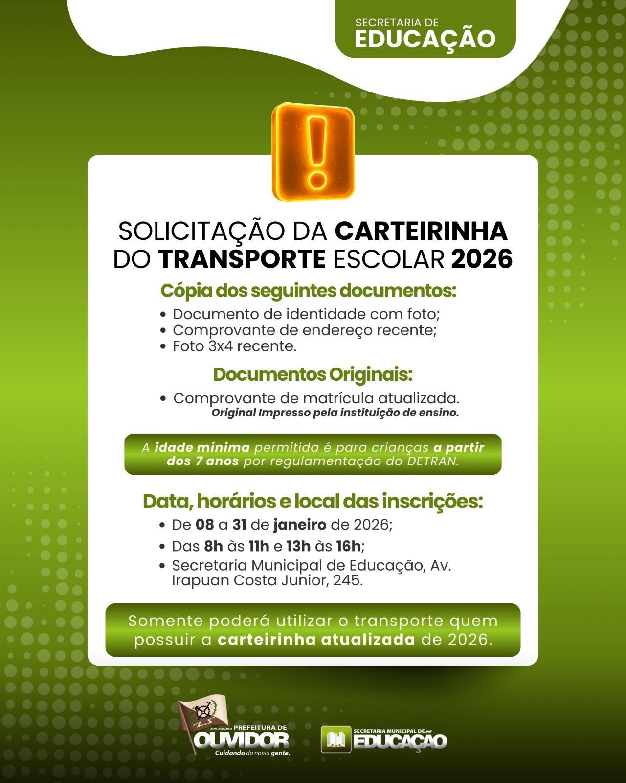 Já estão abertas as inscrições para solicitação da carteirinha do transporte escolar do ano letivo de 2026 para estudantes do município de Ouvidor. O benefício é destinado aos alunos que utilizam o transporte oferecido pela rede municipal de ensino.