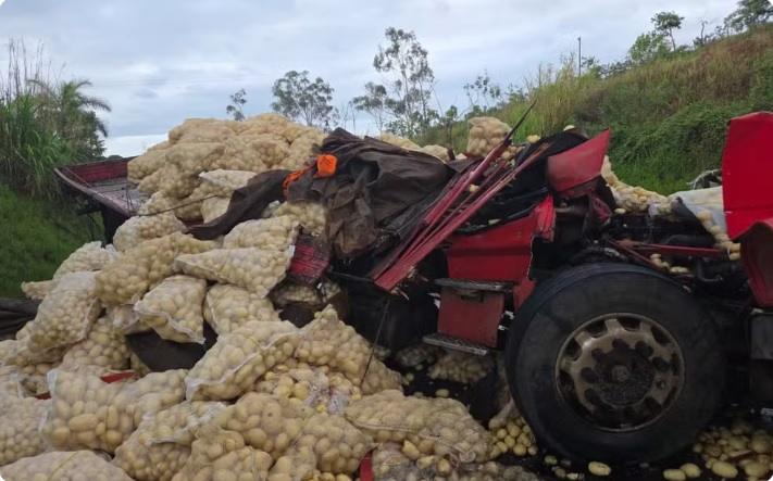 A carga de batatas se espalhou pela pista, interditando a rodovia. O Corpo de Bombeiros realizou a limpeza e aplicou serragem para evitar novos acidentes.