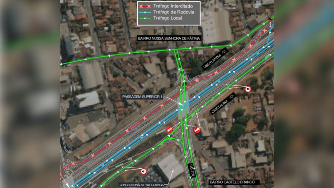Mapa explicativo sobre como ficará o trânsito no local Foto: Divulgação/Ecovias Minas Goiás