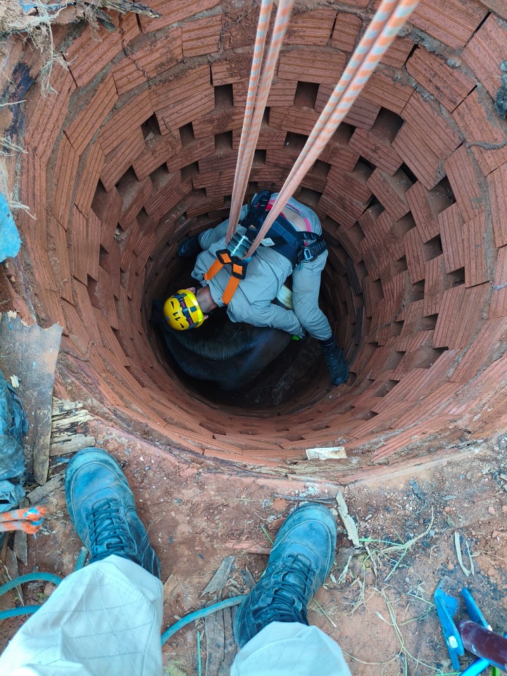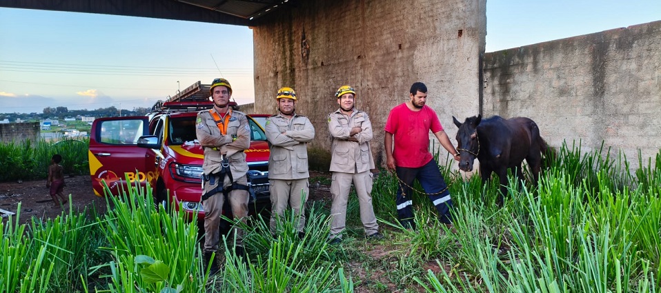 No local, a equipe constatou que se tratava de uma égua, presa em uma fossa com aproximadamente três metros de profundidade. Segundo os bombeiros, a estrutura estava desativada e o animal não apresentava ferimentos aparentes.