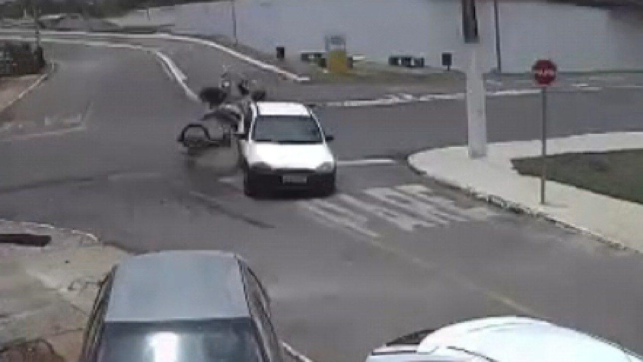 Condutor do Chevrolet Corsa avançou a sinalização e colidiu com o motociclista que que tinha a preferencial