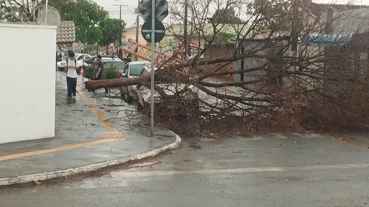 Forte ventania derrubou árvore em Catalão; em outro setor foi registrado chuva de granizo