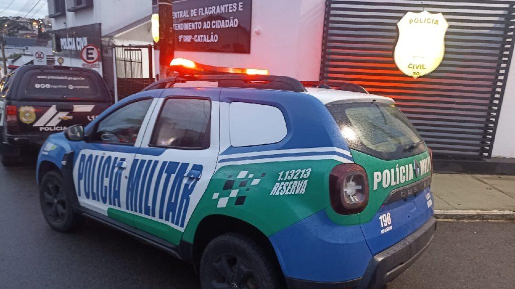 Viatura de PM na porta da Central de Flagrantes em Catalão, para onde o homem foi levado