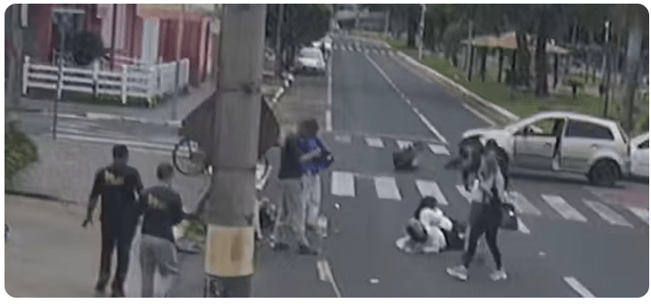 Enquanto as vítimas estavam caídas, um homem se aproveitou da situação de vulnerabilidade, furtou o celular da condutora e fugiu na garupa de outra motocicleta. Toda a ação foi registrada por câmeras de segurança.