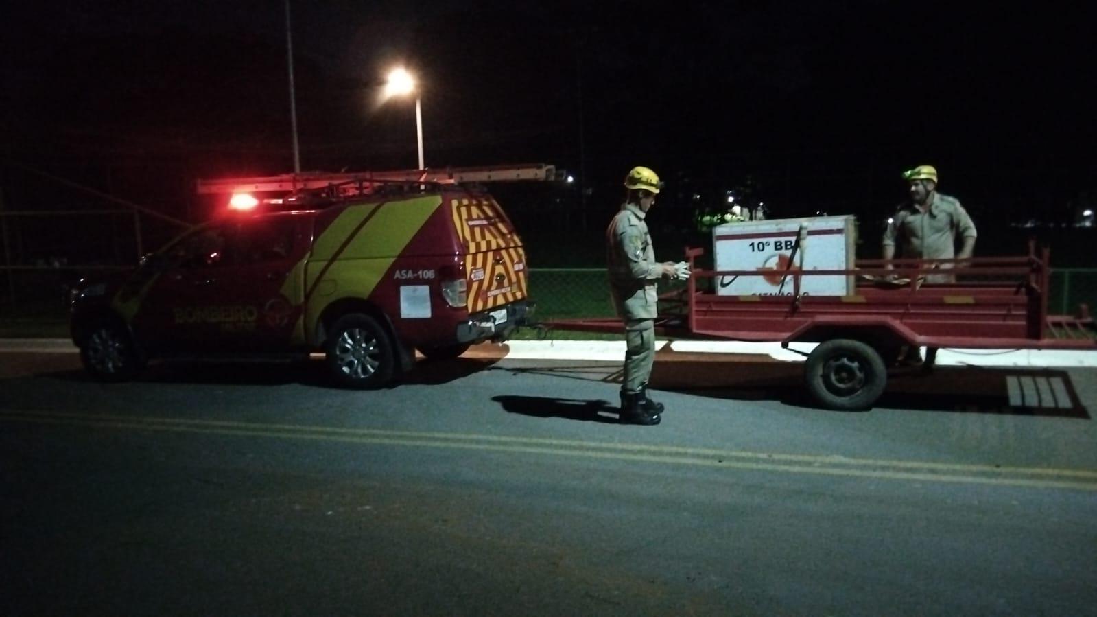 Na noite desta terça-feira, 18/11, por volta das 22h, uma equipe do 10º BBM foi acionada para realizar a captura de um jacaré de aproximadamente 1,50 metro no Condomínio Campo Belo. O animal estava sobre a pista de cooper, localizada na área de reserva ambiental do local.