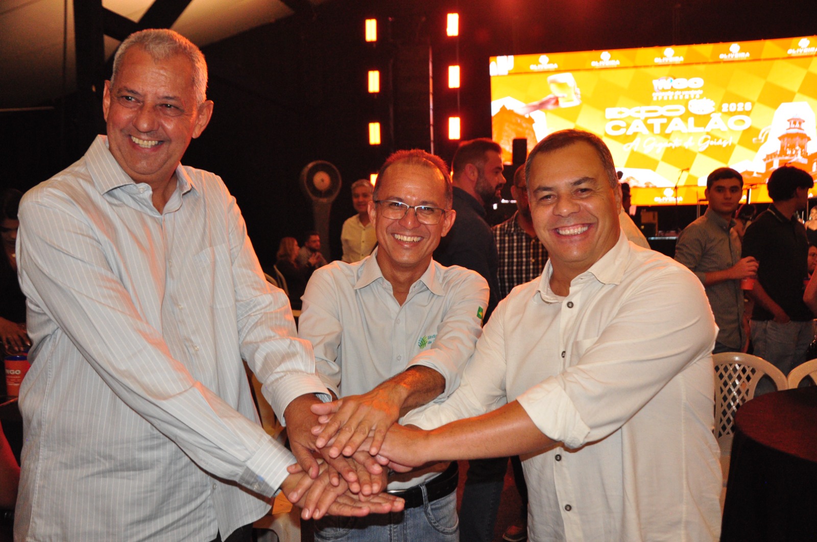 Parceiros da Expo Catalão 2026: Ricardo Pires (Presidente do Sindicato Rural), Velomar Rios (Prefeito de Catalão), Jair Humberto (Presidente da Câmara de Vereadores)