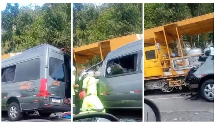 A PRF informou que houve colisão traseira entre a van da dupla, uma carreta e um automóvel, totalizando três veículos envolvidos.