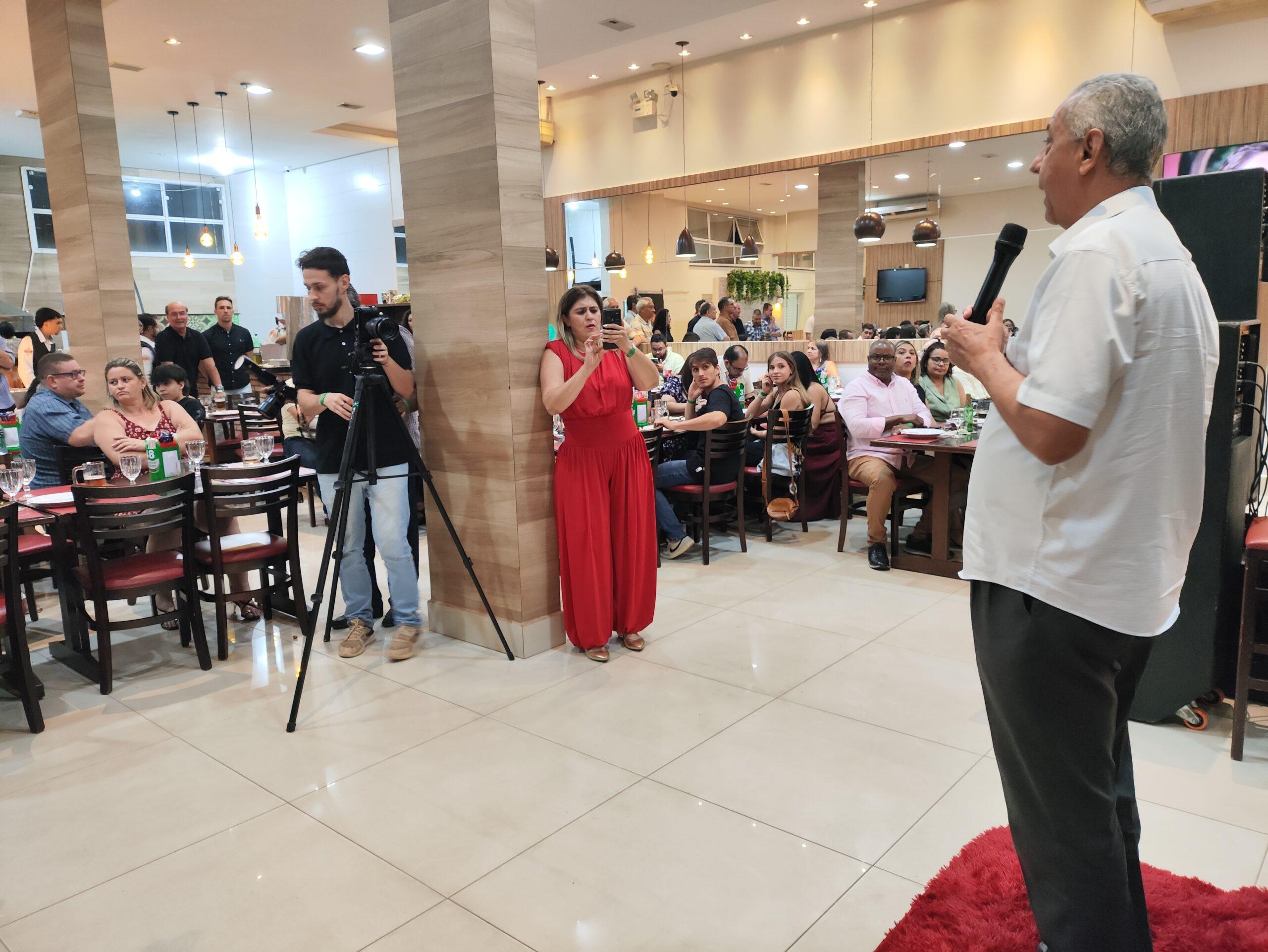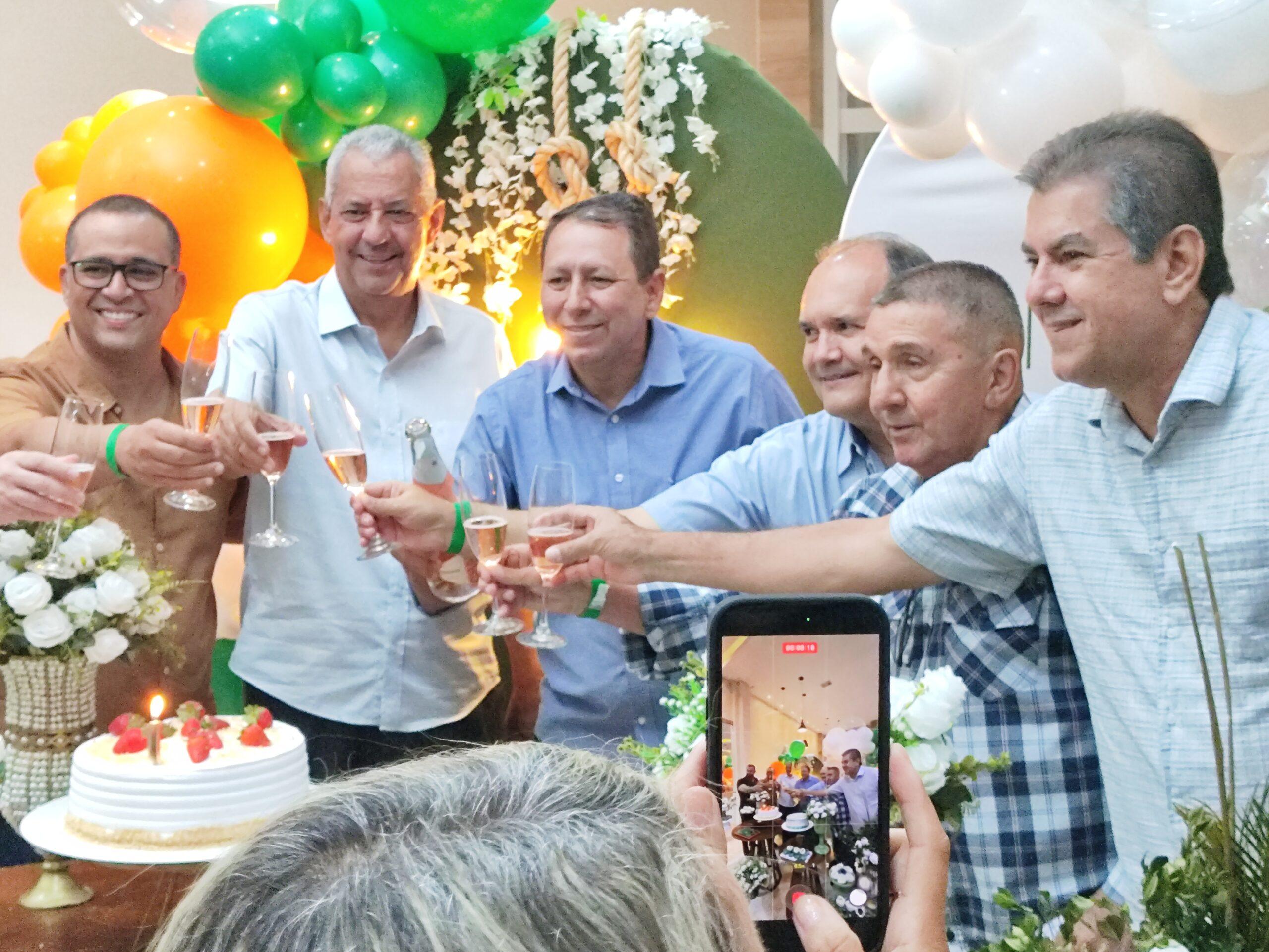 Prefeito Velomar, secretário de Comunicação Valdeci Barros, e outros integrantes da gestão municipal na festa de confraternização da imprensa Foto: Jornal Dito e Feito