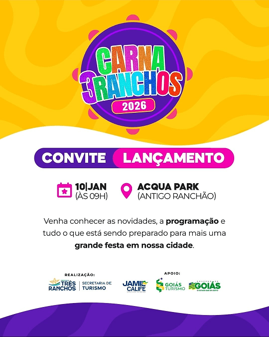 A Prefeitura de Três Ranchos convida toda a população para participar do lançamento oficial do Carna 3 Ranchos 2026, um dos eventos mais aguardados do calendário cultural do município.